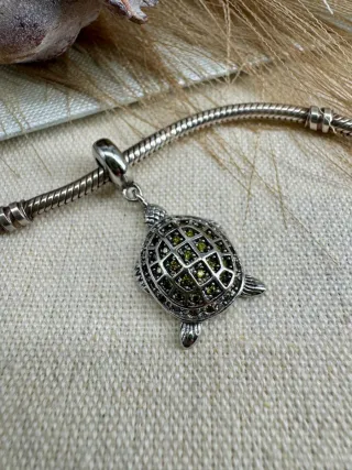 Este encantador charm con forma de tortuga es un accesorio único para tu pulsera. - Diseño detallado de tortuga. - Incrustaciones de circonitas verdes. - Cierre de clip plateado.