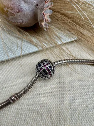 Charm de plata con un diseño esférico adornado con pequeñas gemas. - Diseño con gemas en tonos púrpura y azul. - Elaborado en plata.