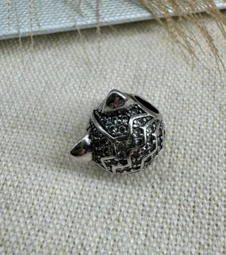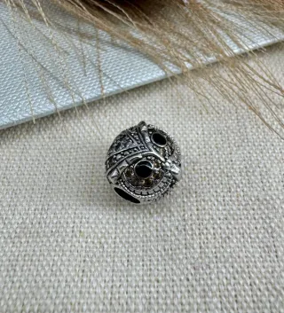 Charm con diseño intrincado y detalles en relieve. Ideal para personalizar pulseras o collares. - Diseño esférico con patrón geométrico. - Acabado plateado con incrustaciones negras.