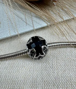 Charm con un diseño intrincado y una piedra central negra. - Detalles plateados. - Apto para pulseras de abalorios.