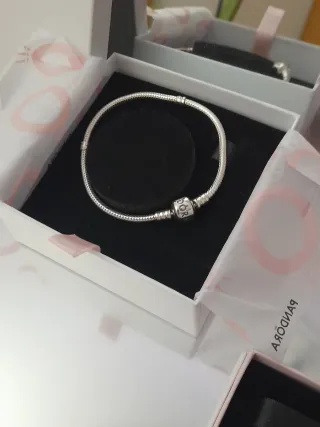 Pulsera de la marca Pandora, con un diseño elegante y atemporal. Nueva, a estrenar. - Cadena tipo serpiente. - Cierre de seguridad. - Un charm con el logo de la marca. - Se puede hacer un pack con charms