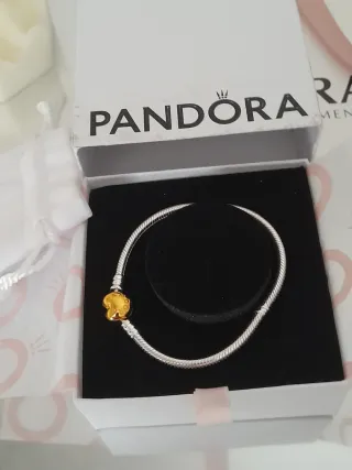 Pulsera Pandora con un charm de corazón dorado. - Diseño de cadena tipo serpiente. - Cierre seguro. - Combina plata y oro. - Se puede hacer un pack para completar la pulsera -La pulsera esta por estrenar.