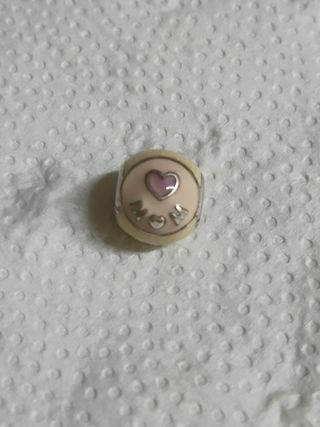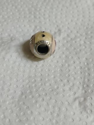 Charm de la marca Pandora con un diseño elegante. - Color principal beige con detalles en rosa. - Inscripción PANDORA visible.