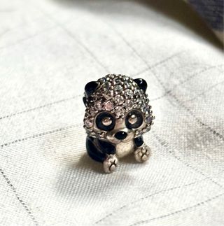 Conjunto de abalorios de la marca Pandora. Incluye un charm con forma de panda y dos abalorios redondos con circonitas rosas. - Charm de panda detallado. 60€ - Clips con incrustaciones de piedras rosas. 30€ la unidad