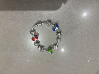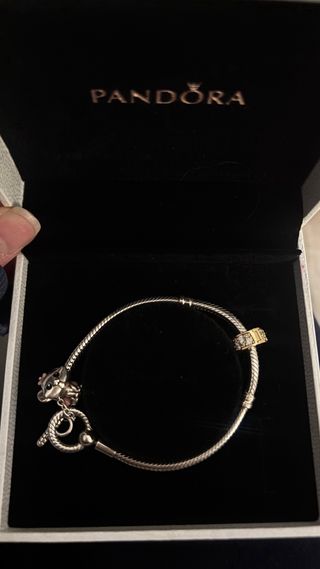 Comprada hace un par de meses. Todo original de la marca Pandora. Una pulsera y cuatro espaciadores. Elegante pulsera Pandora con un charm central en forma de corazón. El diseño de serpiente le da un toque clásico. - Charm de corazón. - Diseño de cadena de serpiente.