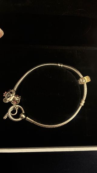 Pulsera de la marca Pandora con un charm de ratón y otro detalle. - Charm de ratón con detalles en rosa. - Charm con circonitas y detalles dorados.