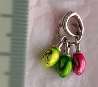 Conjunto de tres charms para pulsera, estilo Pandora de plata. 10€ cada uno! - Charm en forma de corazón plateado con inscripción. - Charm de mariquita en tono rosado con detalles. - Charm circular con esmalte verde.