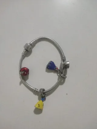 Pulsera de plata con varios charms de Disney. - Charm de manzana roja. - Charm de vestido amarillo con detalles azules y rojos. - Charm de zapato azul con detalles rojos.