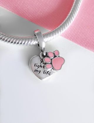 🔸 Charm para pulsera Pandora, de PLATA con su sello S925 🔸 Doble colgante, una huella de perro / gato rosita que brilla en la oscuridad y corazón con la inscripción "You light up my life" (Iluminas mi vida) 🔸 Se entrega en cajita