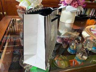 Bolsa de la marca Thomas Sabo, colección Charm Club. Presenta un diseño de rayas verticales en blanco y negro. - Asas de cuerda trenzada. - Círculo central con el logo de la marca. 19x15x8
