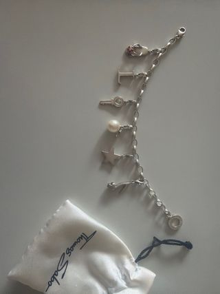 Pulsera de la marca Thomas Sabo con varios charms. - Charm de pintalabios. - Charm con la letra 'M'. - Charm de bolso rojo. Le hace falta una buena limpieza no está roto - Charm de cruz. - Charm de cuerno. - Charm de fresa. - Charm de sujetador. - Charm de trébol de cuatro hojas.