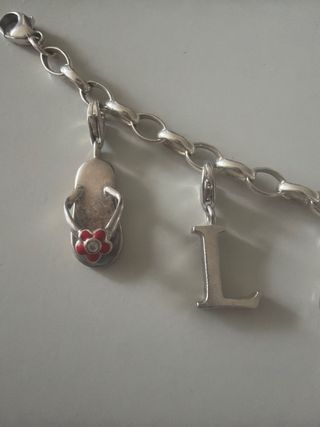 Elegante pulsera de la marca Thomas Sabo, elaborada en plata y adornada con varios charms. - Charm de zapatilla con detalle floral. - Charm con letra 'L'. - Charm de llave. - Perla. - Charm de estrella. - Charm de zapato de tacón. - Cierre de mosquetón y cadena de ajuste. - Incluye bolsa de tela original Thomas Sabo.