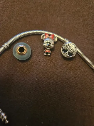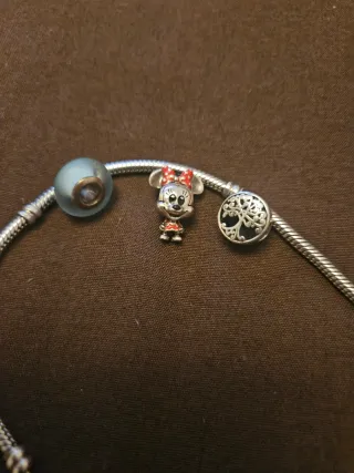 Pulsera de la marca Pandora con varios charms. - Charm de Minnie Mouse con lazo rojo. - Charm del árbol de la vida. - Charm esférico azul. Cada charm por separado 25€