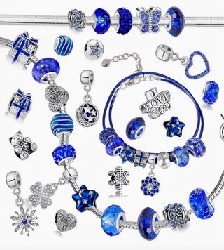 Conjunto de 24 piezas de abalorios para crear tu propia pulsera o collar. - Diseños variados con temática de estrellas, corazones, mariposas y más. - Incluye charms colgantes y cuentas para ensartar. - Incluye pulsera y collar. - Compatible con pulseras tipo Pandora.