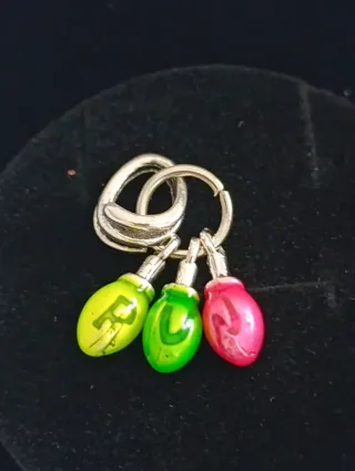 Charm inspirado en Stranger Things, con un diseño de bombillas de Navidad. - Tres charms colgantes: uno amarillo con la letra 'R', uno verde con la letra 'U' y uno rosa con la letra 'N'. - Cierre de aro plata. - Brilla en la oscuridad. - Incluye caja de regalo. - precio sin cajita de regalo 12€.