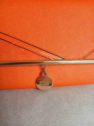 Elegante bolso de mano en llamativo color naranja, con detalles dorados. - Diseño tipo sobre con solapa. - Asa metálica dorada. - Charm colgante con logo.