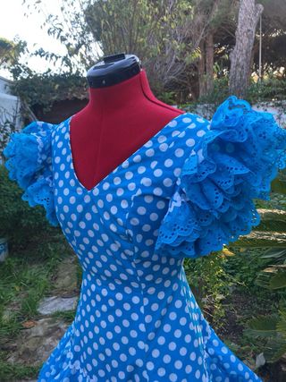 Disfraz de muñeca con un diseño encantador. - Vestido azul con lunares blancos. - Delantal blanco. - Gorro blanco. - Cinturón blanco.