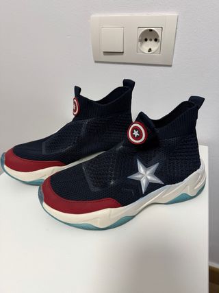 Zapatillas infantiles inspiradas en el Capitan america. Diseñadas con un estilo deportivo y llamativo. - Detalle de estrella plateada en el lateral. - Adorno circular con el escudo de Capitán América en la lengüeta. - Banda roja en la puntera y el talón. - Suela blanca con detalles en azul claro.