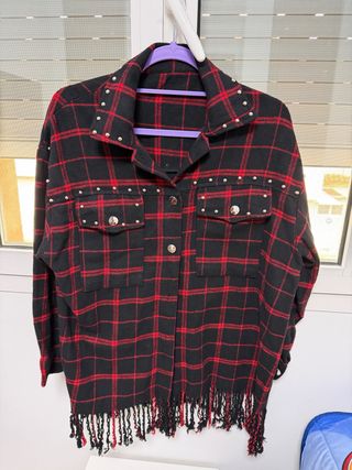 Camisa de paño con un diseño a cuadros en rojo y negro. Presenta detalles de tachuelas metálicas en cuello, solapas y bolsillos. El bajo de la camisa está adornado con flecos. - Diseño a cuadros. - Tachuelas metálicas decorativas. - Flecos en el bajo.