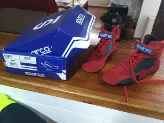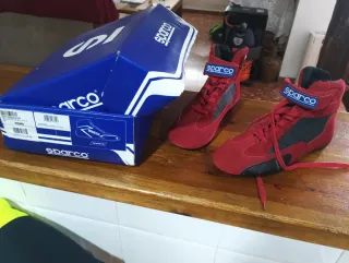 Botas de carreras Sparco en color rojo y negro. Diseñadas para automovilismo. - Cierre con cordones. - Detalle de velcro en el tobillo. - Suela antideslizante.