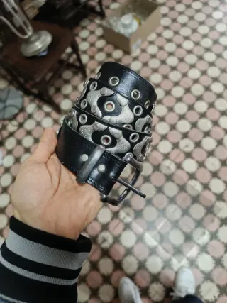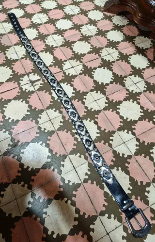 Cinturón auténtico de los años 80 decorado con piezas metálicas y ojetes - Hebilla metálica. - Detalle de eslabones y ojales. - Correa de cuero. - 117cm