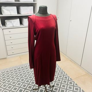 Vestido de corte elegante en color burdeos. - Diseño de manga larga. - Escote barco. - Pinzas delanteras para un mejor ajuste. - Bolsillos laterales. - Largo hasta la rodilla.