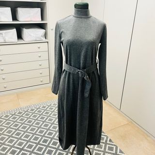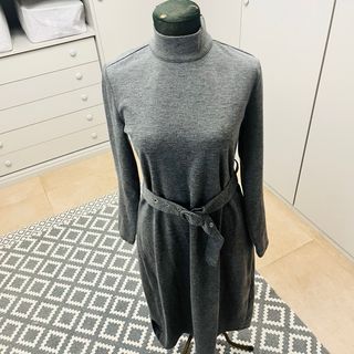Vestido de corte formal en color gris, con un diseño elegante y moderno. - Cuello alto. - Manga larga. - Cinturón a juego con hebilla. - Largo midi.