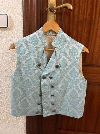 Elegante chaleco con un diseño damasco en tonos azul claro y blanco. Ideal para fallas , esta en perfecto estado y si marcas - Con bolsillo interno para guardar cosas - 📏Mide : 57 cm de largo , es para un niño de 13/14 años aprox