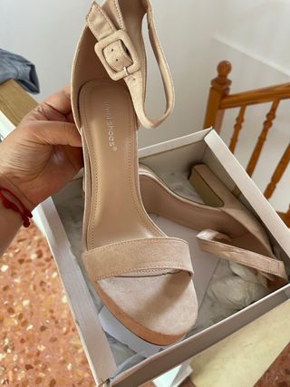 Elegantes zapatos de tacón con un diseño moderno. - Tacón grueso y plataforma. - Tira al tobillo con hebilla. - Acabado tipo ante.
