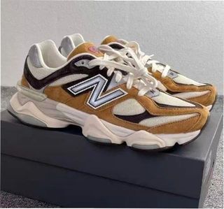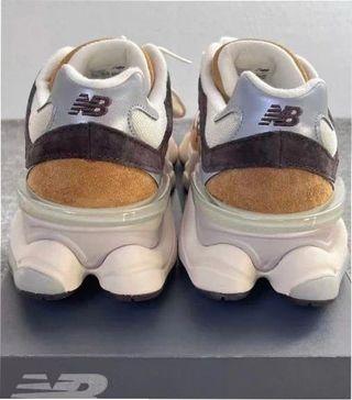 Zapatillas New Balance 9060 en talla 37.5. Un diseño moderno y cómodo. - Combinación de colores beige y marrón. - Logo 'N' característico en los laterales.