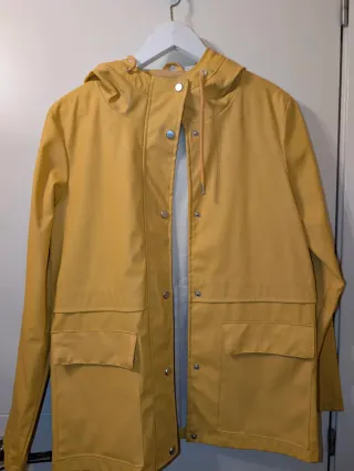 Chubasquero fino de la marca Only en color amarillo. Perfecto para el típico día de lluvia de primavera. - Diseño con capucha. - Cierre de botones a presión. - Dos bolsillos delanteros. - Cordón ajustable en la capucha. Tiene alguna mancha de roce, se ve en las fotos, que es habitual en este tipo de prendas.