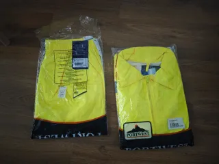 Conjunto de dos chubasqueros con detalles reflectantes de trabajo. - Parte superior en color amarillo brillante. - Parte inferior en color azul marino. - Bandas reflectantes horizontales. - Uno nuevo a estrenar y otro un poco usado.