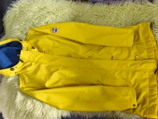 Chubasquero marítimo de color amarillo brillante, ideal para la pesca o actividades al aire libre. Yo mido 1,80 m y me queda un poquitín grande. - Cierre de cremallera y botones a presión. - Dos bolsillos frontales con solapa y dos bolsillos interiores. - Puños con ajuste. - Forro interior azul marino. - Precio nuevo 89 €