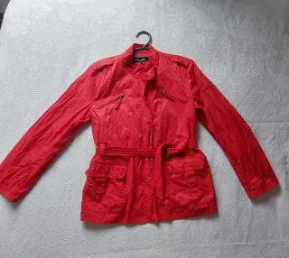 Chubasquero de color rojo con un diseño moderno y práctico.10 euros. Mira mi perfil. Todo impecable. - Cierre frontal con cremallera. - Dos bolsillos laterales con cremallera. - Puños ajustables con botón.