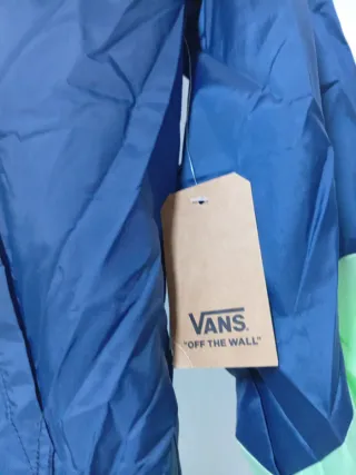 Chubasquero con capucha de la marca VANS, perfecto para protegerte del viento y la lluvia ligera. Su diseño combina colores llamativos para un estilo urbano. - Diseño de bloques de color. - Cierre de botones a presión en el cuello. - Bolsillo canguro en la parte delantera. - Puños elásticos en las mangas.