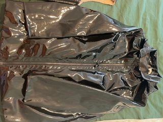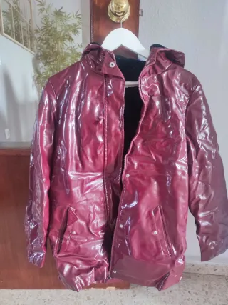 Abrigo tipo chubasquero con un acabado brillante y forro interior. - Diseño moderno y llamativo. - Cierre de cremallera y botones a presión. - Bolsillos frontales con botón.