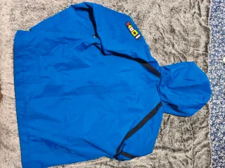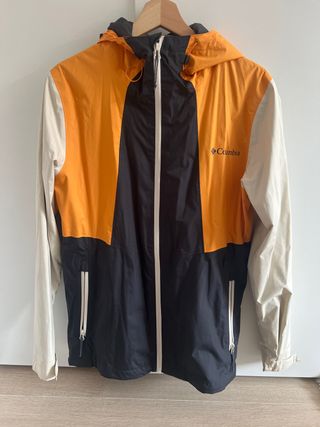 Chubasquero con diseño de bloques de color. Capucha ajustable y Bolsillos laterales con cremallera. Un bolsillo esta preparado para meter el chubasquero dentro. Costó mas de 80 euros en El Corte Inglés