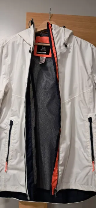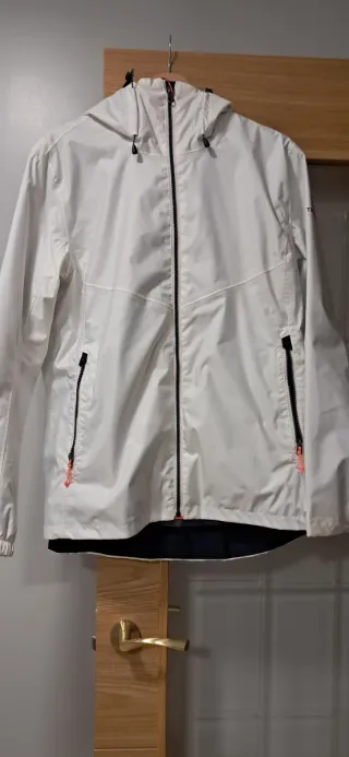 Chaqueta impermeable de color blanco, con borde naranja. Ideal para protegerte de la lluvia. - Cierre de cremallera frontal. - Capucha ajustable. - Bolsillos laterales con cremallera.