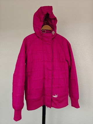 Chaqueta marca Puma, con capucha, rosa fucsia, talla M / 42 (en la etiqueta). Material sintético, acolchado, exterior impermeable, interior polar fino. Cremallera con apertura inferior y superior. Con 2 bolsillos laterales. Largo total desde hombro 64 cm Largo total manga desde cuello 75 cm Ancho manga a la altura sisa 18 cm Ancho cuerpo bajo sisa 50 cm Ancho cuerpo en caderas 48 cm Peso 600 g