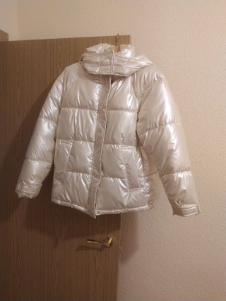 Plumífero beige Stradivarius de la talla M con capucha de quita y pon con cremallera. Usado pero en buen estado