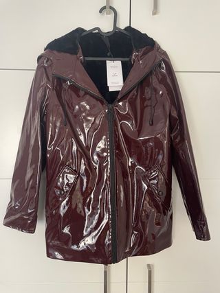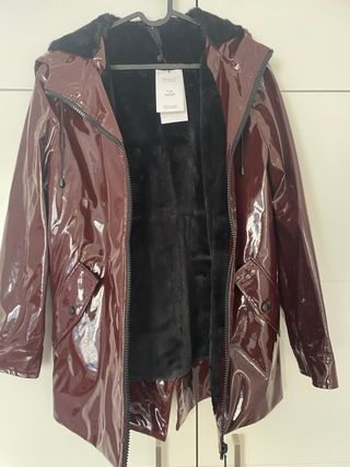 Chubasquero con acabado brillante y forro interior de pelo sintético. Completamente nuevo, a estrenar. Con la etiqueta. - Capucha con ribete de pelo. - Cierre de cremallera. - Bolsillos laterales con botón. - Color Bourdeos