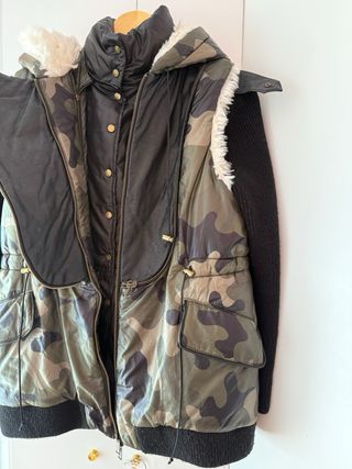 Abrigo chaleco forrado con pelito muy suave. Se hace chubasquero con capucha. Un par de usos. Al estar guardado se ha despellejado un poco una parte del frontal (mirar últimas fotos) Pone talla S pero talla como XS