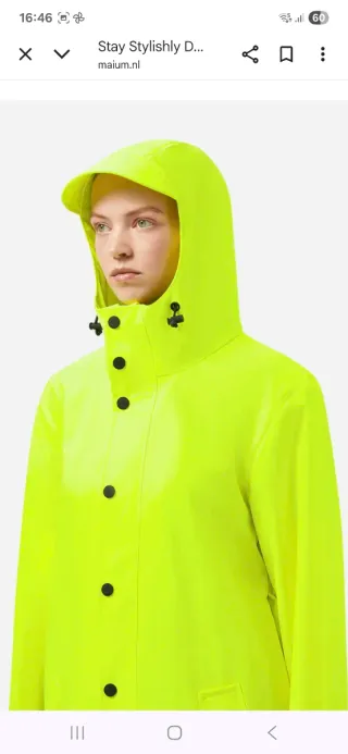 Chaqueta tipo chubasquero en color amarillo. - Con capucha. -Es un chubasquero para vestir pero no es de material técnico para montaña.