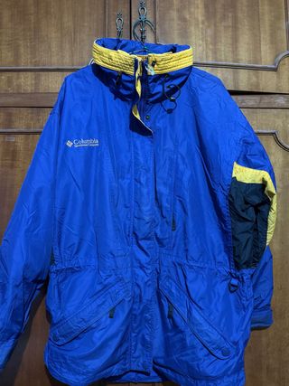 Chubasquero Columbia de mujer en talla M. Perfecto para actividades al aire libre. - Diseño en color azul con detalles amarillos. - Capucha ajustable. - Bolsillos frontales con cremallera. - Bordados en el cuello tanto en la parte interior y exterior trasera. Único fallo: el tirador se rompió pero se puede poner otro.