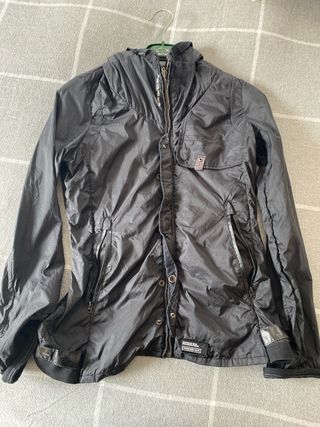 Chaqueta tipo cortavientos/chubasquero en color negro. Tienen automaticos para regular el ancho de las mangas, y unos cordones adelante para estrechar la cintura. Es muy practica porque lleva un bolsillo interior con cremallera y se convierte como en un bolso