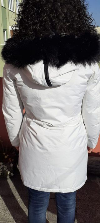 Parka con capucha de pelo y múltiples bolsillos, aberturas inferiores con cremallera y la capucha tambien se puede abrir. Cierre de cremallera y botones. Forro acolchado con un bolsillo interior y cintura ajustable mediante elástico. Abriga un montón vale para la nieve. Presenta algunas manchas(en fotos)