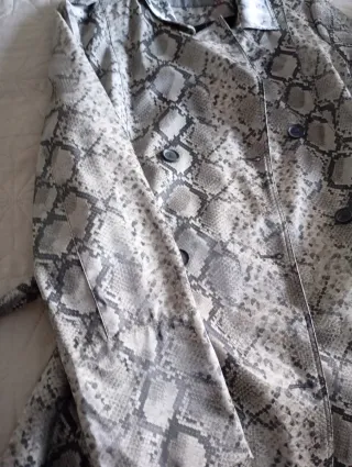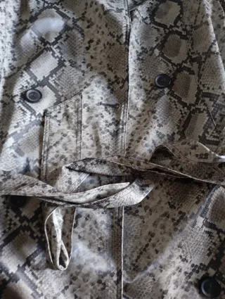 Chubasquero con un llamativo estampado de serpiente. - Diseño de doble botonadura. - Cuello de solapa. - Cinturón a juego.