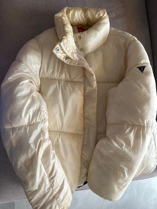 Chaqueta acolchada de la marca Guess en color beige. Se encuentra en muy buen estado. - Diseño acolchado. - Cuello alto. - Cierre de cremallera y botones a presión. - Logo de la marca en la manga.