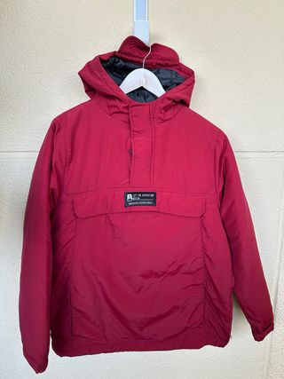 Chaqueta anorak estilo canguro en color burdeos. - Capucha. - Bolsillo frontal. - Cierre de botones y cremallera parcial. - Detalle de etiqueta con texto LET THE ADVENTURE BEGIN AMERICAN EXPERIENCE.