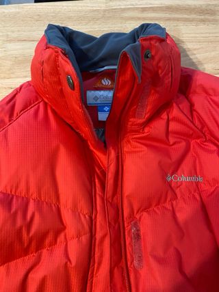 Anorak Columbia de color rojo, ideal para esquiar. Presenta un diseño acolchado y un cuello alto. - Cremalleras en los bolsillos laterales. - Puños ajustables. - Cierre frontal con cremallera y botones a presión.